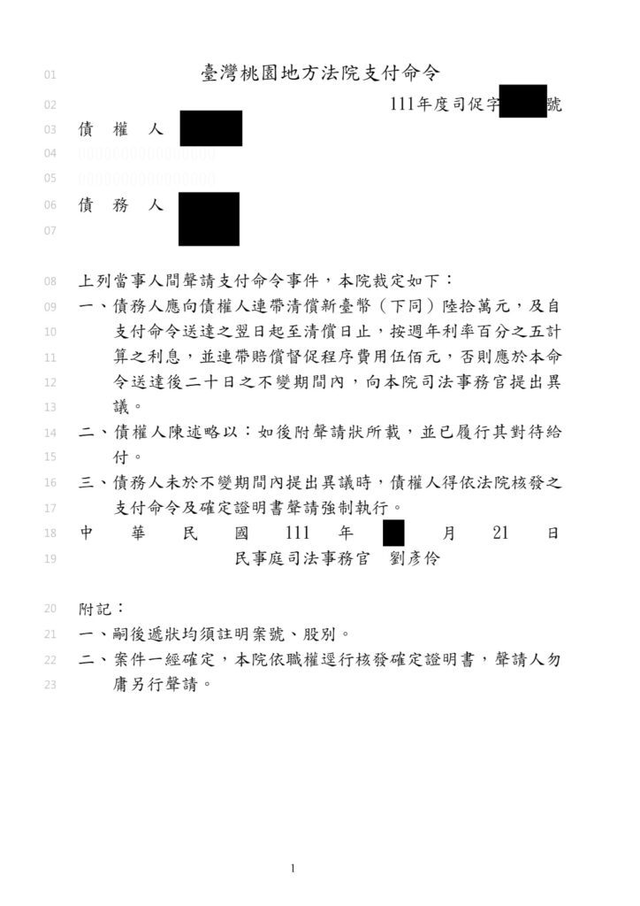 賠償金額與債權:林媽損失合計新臺幣60萬元,獲得了法院核發的支付命令裁定,以及確定證明書。